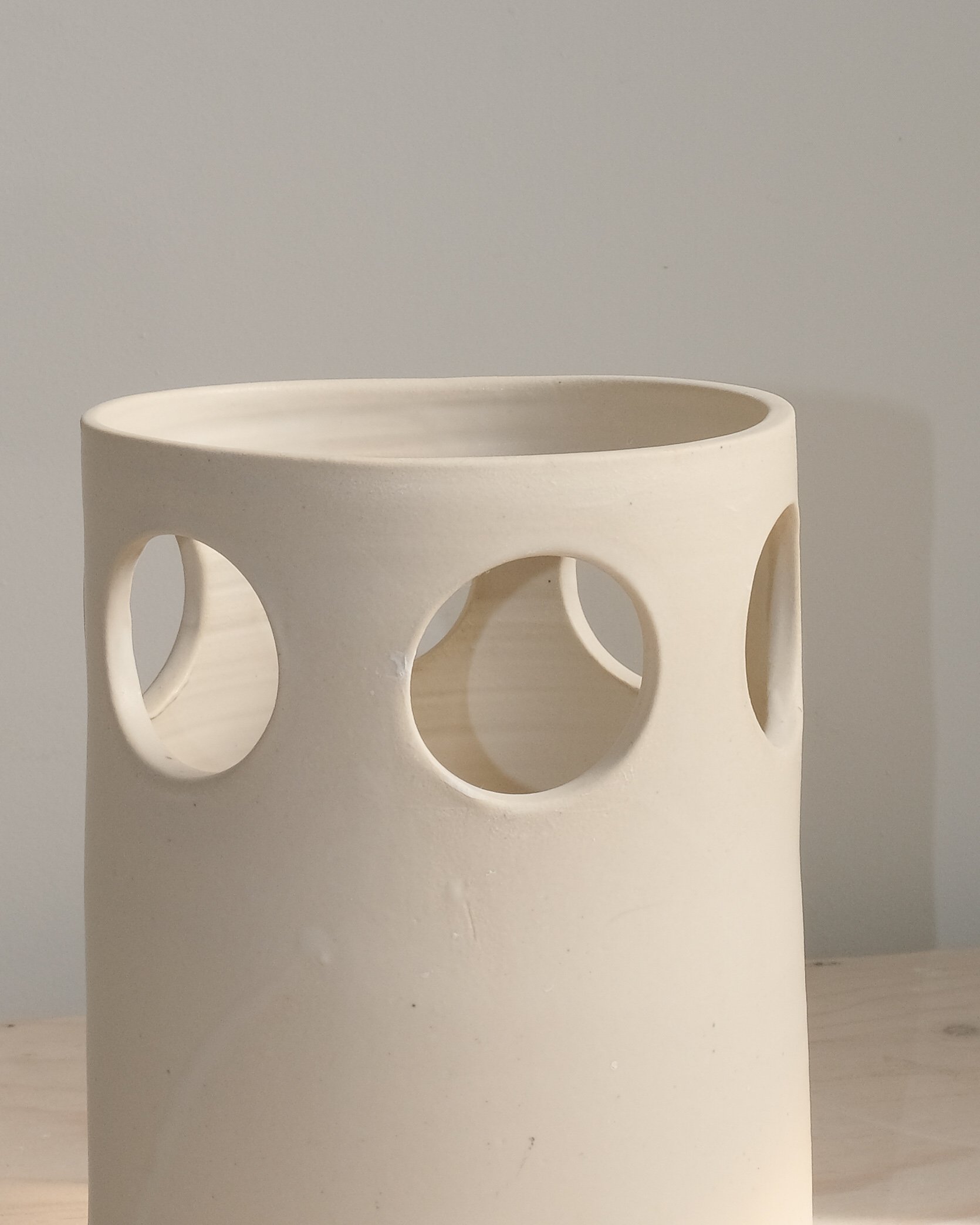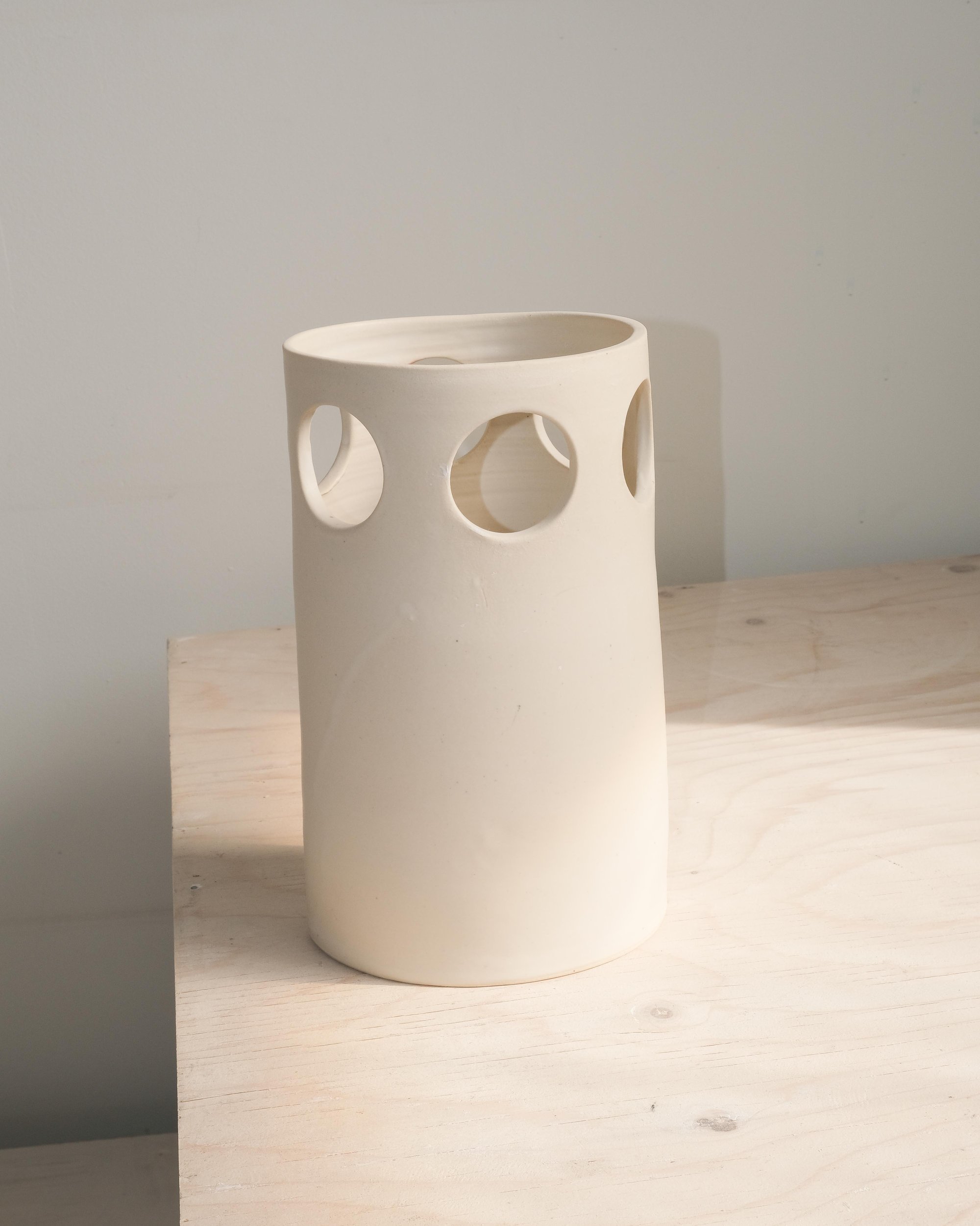 A modern vase inspired by graphic cut-outs of 60’s fashion. Made from stoneware and finished in a matte ivory glaze, features cut-out openings that let the stems peek through. Clean, sculptural, and easy to style.