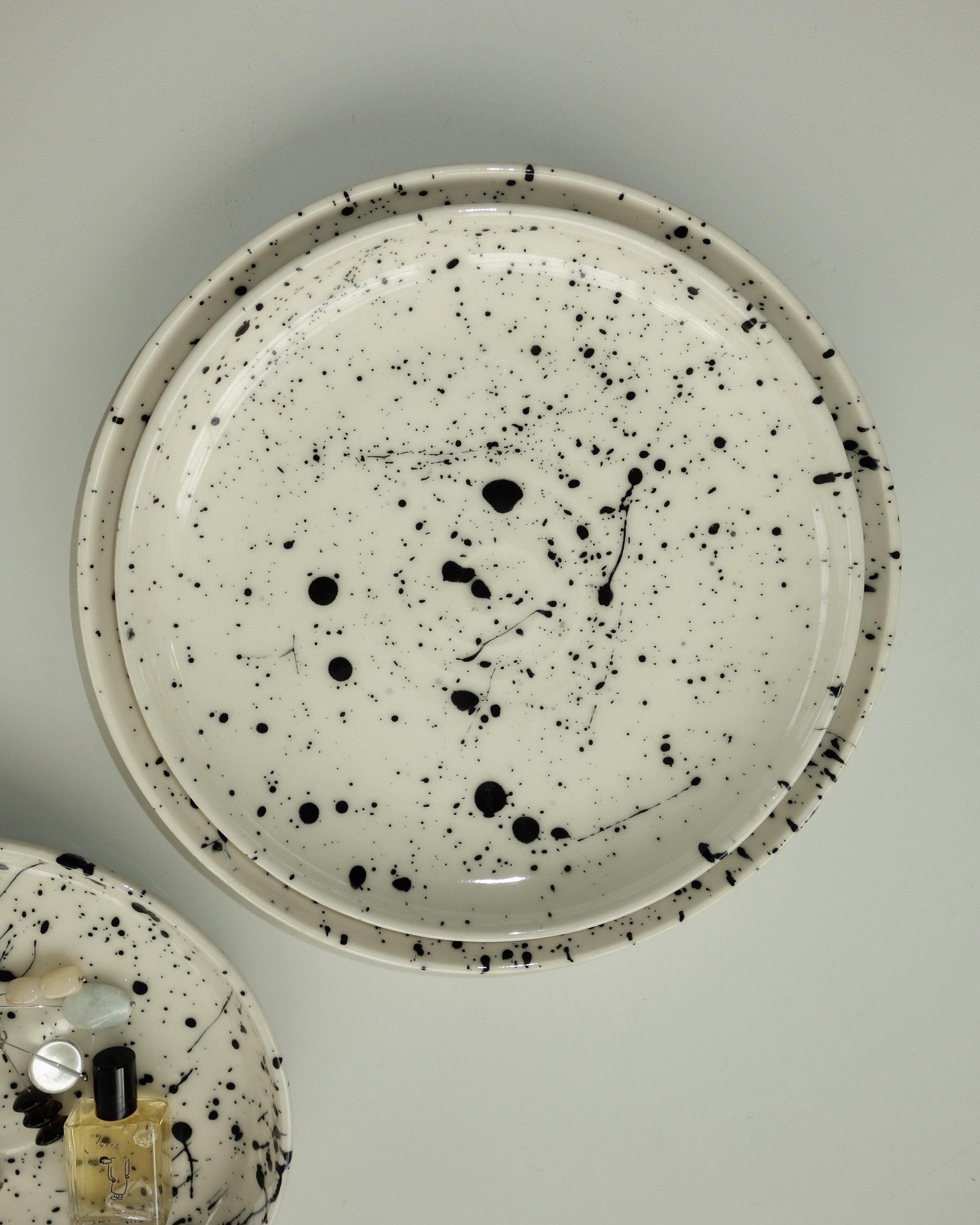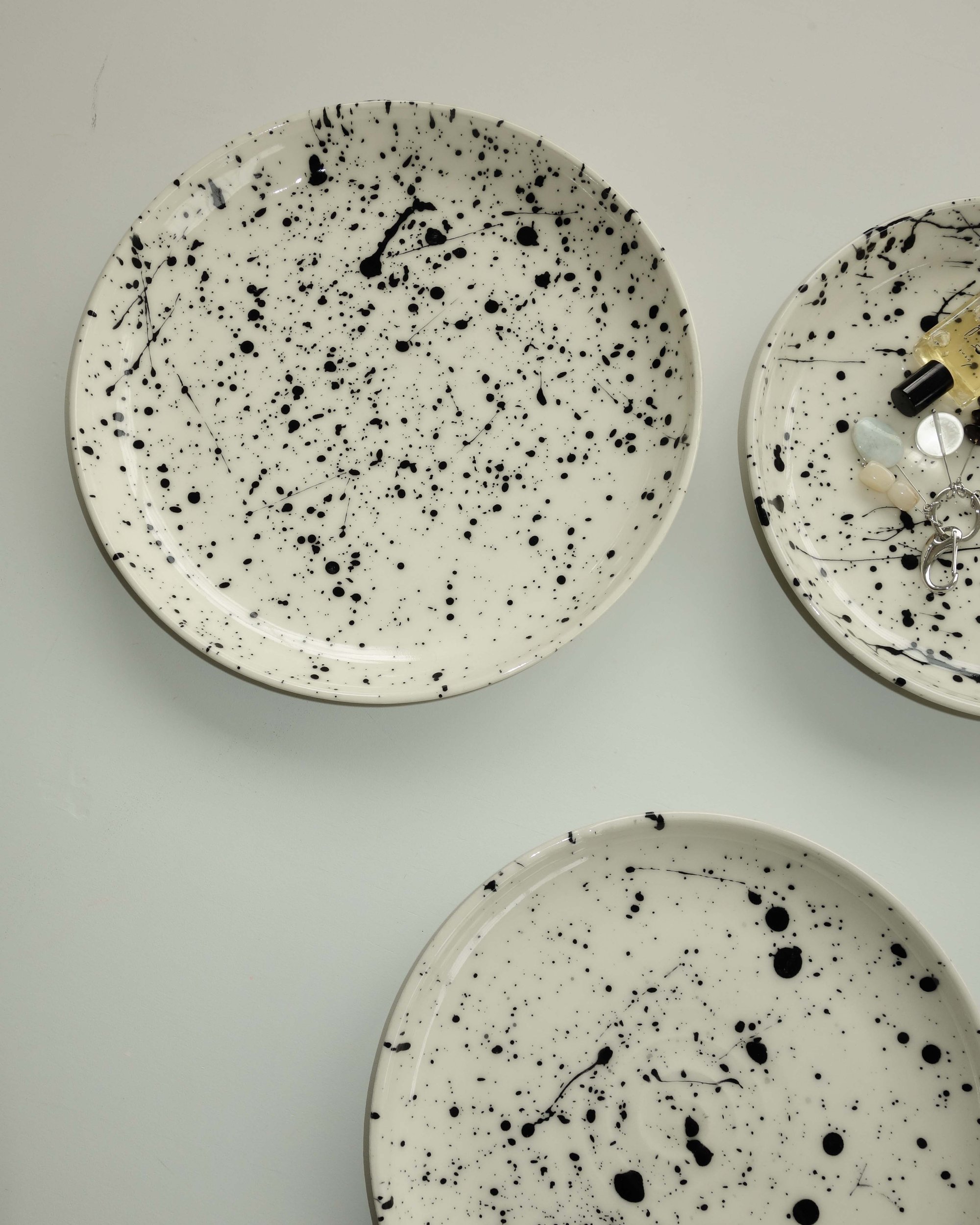 Hand thrown from a textured stoneware finished in bright gloss glaze covered in wild, expressive bursts of splatters. The spiral detail is added to highlight the process of throwing.